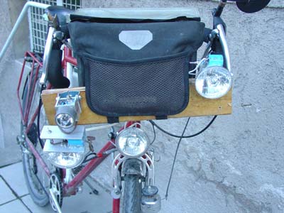 Am schwierigsten war zum Schluss – und unter wachsendem Zeitdruck – die Lösung der Frage: Wie befestige ich die drei Lampen denn nun am Fahrzeug – mit erreichbaren Schaltern und bitte jede Leuchte zumindest vertikal schwenkbar? Die Wahl fiel auf ein Brett, das ich zwischen der Ortlieb-Lenkertasche und deren Dokumentenfach durchfädelte. Der »Halbe« und der »Ganze« hatten keine individuelle Höhenverstellung, der Ganze war sogar mit Heißkleber direkt am Brett angeklebt . Ich hatte enormes Glück, dass, wie sich später herausstellte, Höhe und Seitenposition der Lampen halbwegs passten.