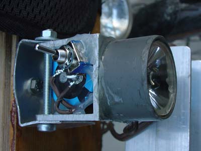 Der »Halbe« war viel mehr Arbeit: Nachdem die FL-Optik (Spende von Schmidt Maschinenbau, Tübingen) durchgesägt und der Star-Emitter mit M2-Schrauben an einem U-Profil befestigt war, musste die LED genau in den Brennpunkt des Hohlspiegels gebracht werden. Das erforderte Probeleuchten. Mangels verfügbarer Konstantstromquelle versorgte ich die LED mit einem Autobatterie-Ladegerät, dessen Primärspannung ich mit einem Ringkern-Regeltrafo anpasste. Merkwürdigerweise habe ich dabei keine LED zerstört, obwohl die Chance bei diesem Verfahren recht hoch war.