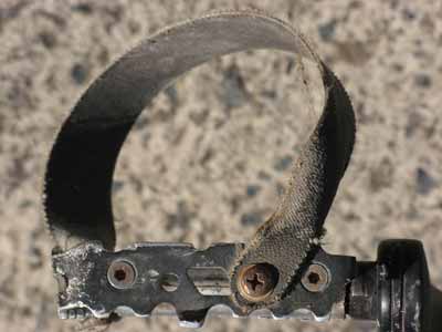 Alle Jahre wieder, nach vielem Hin- und Herknautschen, brachen die Haken – immer an der gleichen Stelle: an dem Auge für die Riemchen. Oder es riss einer der Pedalriemen. Aber LOOK oder andere Systempedale kamen mir nicht in den Sinn. Sie waren mir zu teuer und zu unflexibel, was die Schuhauswahl angeht. So hatte ich mich mit den Schwächen des Systems eigentlich abgefunden bis … ja, bis ich mich dabei ertappte, beim Schuhkauf nur noch darauf zu achten, ob denn auch keine Nähte im Scheuerbereich der Haken seien und mir am Ende immer klobigere Exemplare mit großzügiger Gummikappe zulegte. Mein Reiserad ist nämlich auch mein Alltagsrad und es wurmte mich daher gewaltig, dass die Rennhaken früher oder später jeden Schuh ruinierten.