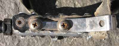 Das andere Ende wird an einer Halterung (vgl. Bild 3) an der Vorderseite mit einer Inbusschraube festgeklemmt (vgl. Bild 4). An dieser Stelle lässt sich dann die Länge des Riemens variieren. Welche Einstellung optimal ist, hängt von den Maßen des Schuhs ab und muss ausprobiert werden. Zur Beruhigung: Wenn man nicht zu hohe Anforderungen an die Kraftübertragung stellt, lässt sich eine Länge finden, die einen guten Kompromiss für verschiedene Schuhe darstellt. Das System fährt sich gut. Den Ein- und Ausstieg lernt man schnell, ich finde ihn eher einfacher als mit anderen Pedalsystemen (vgl. Bild 5–7). Der Schuh »sitzt«, ohne das frau sich zum Anziehen der Pedalriemen herunterbeugen muss. Auch mit hoher Trittfrequenz lässt es sich gut kurbeln.