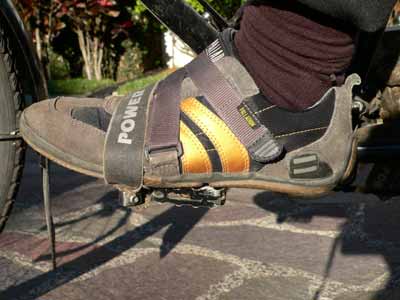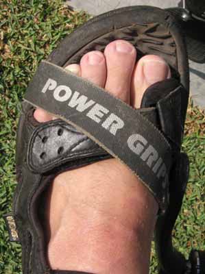 Ansonsten fällt meine Bilanz jedoch positiv aus. Gerade Reiseradler, die länger unterwegs sind, werden sich über die Unabhängigkeit beim Schuhkauf freuen. Denn frau sitzt schließlich nicht nur im Sattel und macht vielleicht auch mal längere Ausflüge zu Fuß. Zudem gehen Schuhe auch mal unwiderruflich »in die ewigen Jagdgründe ein« und dann muss man damit weiterfahren, was vor Ort erhältlich ist. Powergrips lassen sich auch in Trekking-Sandalen (Bild 8), – mit Stahlrennhaken oft eine schmerzhafte Angelegenheit – und sogar in klobigen Wanderschuhen gut fahren.