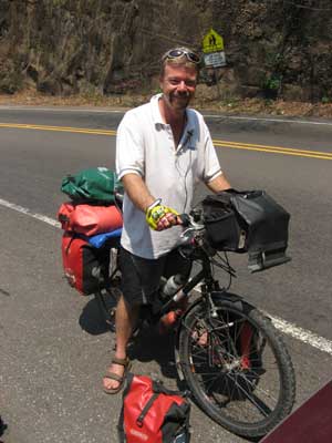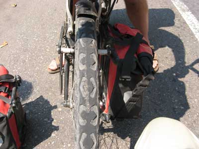 Nach 13.000 km hat er noch keine Probleme mit seinem Lowrider (der eigentlich ein Highrider ist, da das Gepaeck deutlich oberhalb der oberen Befestigungsoese an der Gabel eingehängt wird).