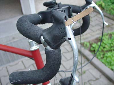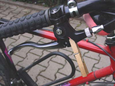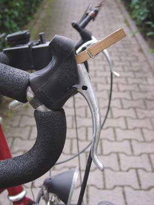 Die gleichzeitig am Rad eines Fellow Travellers gesehene Eigenbau-Lösung war da schon wesentlich preisgünstiger: Eine simple Holz-Wäscheklammer.