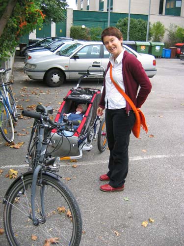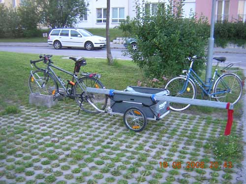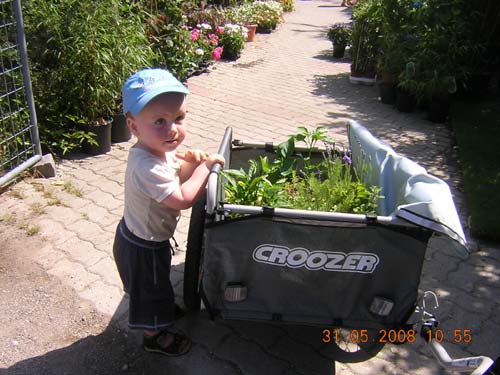 - Lastentransporte. Mittelschwere Transporte (bis ca. 30 Kilogramm) lassen sich mittels Lastenanhänger komfortabel, wenn doch manchmal ein wenig gewöhnungsbedürftig erledigen. So haben wir anlässlich Marjans zweiten Geburtstags für den Freundes- und Verwandtenkreise ein Gartenfest ausgerichtet. Der Verpflegungseinkauf und -transport zum Garten erfolgte großteils per Lastenanhänger. Pflanzen beim Gärtner und Baumaterialien (z. B. Metallsteher für den Garten) in den Nachbarortschaften einkaufen und antransportieren, stellen ebenso leicht zu bewältigende Aufgaben dar wie wie der Abtransport von Abfällen ins stadtperiphär liegende Altstoffsammelzentrum (Bild 2 und Bild 3).