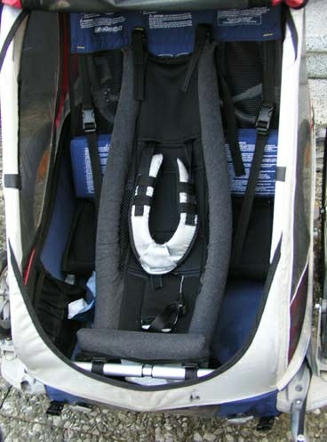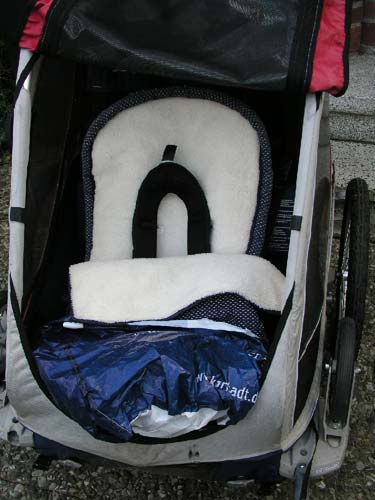 Zuerst wurde die Gestell-Tragetasche eines »geerbten« Teutonia-Kinderwagens verwendet. Da das Gestell nicht komplett reinpasst musste die Rückenlehne des Anhängers oben gelöst und flach gelegt werden. Mit Zurrbändern und Expandern wird die Tragetasche am unten umlaufenden Rahmen des Anhängers fixiert. So kann der Nachwuchs auch nicht herausfallen. Aus den speziellen Kleinstkindtransporttaschen von Weber und Chariot seien nach Aussage der »Verkäufer« die Kleinen sehr schnell herausgewachsen.