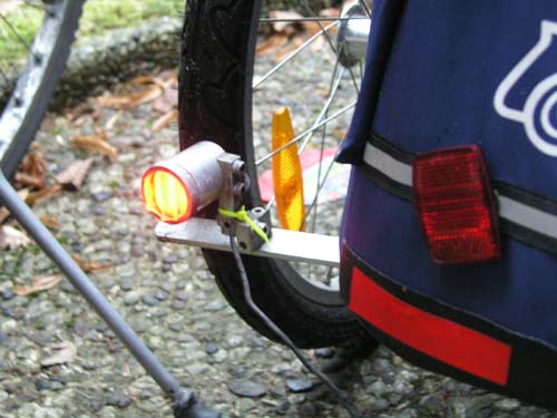 Was auf alle Fälle ausgeschaltet oder entschärft werden sollte: Das Rücklicht vom Zugfahrrad. Es leuchtet den kleinen Passagieren meist direkt in die Augen und blendet. Entschärfen kann man u. a. via bumm Trailermatic, abziehen des Kabelschuhes vom Rücklicht, Schalter, wie in Bild 5, einem Stück weißer Isomatte vor dem Rücklicht …