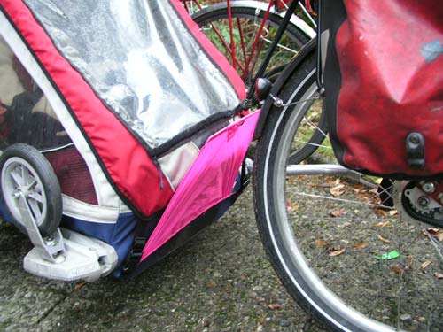 Die Plane (Ripstop-Nylon, Spinnakertuch) ist unten so breit wie der Zwischenraum zwischen den Schnallen für das Verdeck. Oben ca. 20 cm breit und ca. 25 cm lang. Oben und unten sind Stäbe eingezogen. Unten ist der Stab etwas länger und wird in die unteren Gurtbänder der Schnallen eingehängt. Oben ist mittig mit einem heißen Draht ein Loch eingeschmolzen. In dieses Loch fasst ein normaler Expander, welcher am Gepäckträger des Zugfahrrades eingehängt ist. Der Stoff sollte eng an den Stäben anliegen oder etwas steifer sein, ansonsten wird er sich zusammenknautschen und in der Mitte sammeln. Dieser Regenschutz ist wirklich nur bei nasser Straße notwendig. Allerdings könnte es auch im Sommer auf sandigen Wegen sinnvoll sein, wenn sonst nur das Fliegennetz den Nachwuchs schützt.