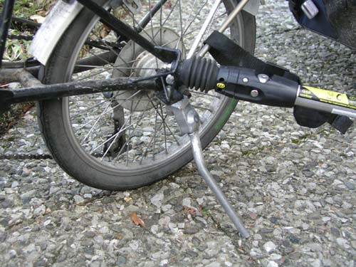 Spätestens, wenn dann der Kinderanhänger am Brompton angebaut ist, braucht das Rad einen Ständer: Das Abstellen über das Einfalten des Hinterbaues funktioniert nicht mehr. Bei dem deutschen Bromptonvertrieb Voss Spezial-Rad soll es seit Herbst 2008 entsprechende Ständer geben. (Laut Information Ende April 2008 auf der Spezi.) Wir mussten unsere Bromptons schon vorher selber entsprechend ausrüsten (vgl. Bild 7).