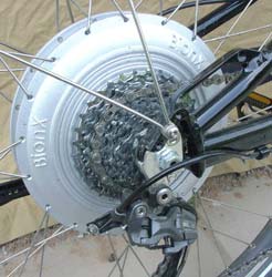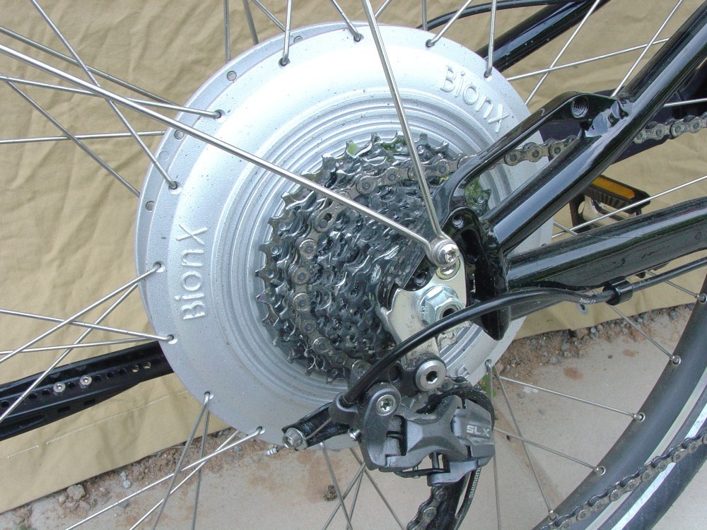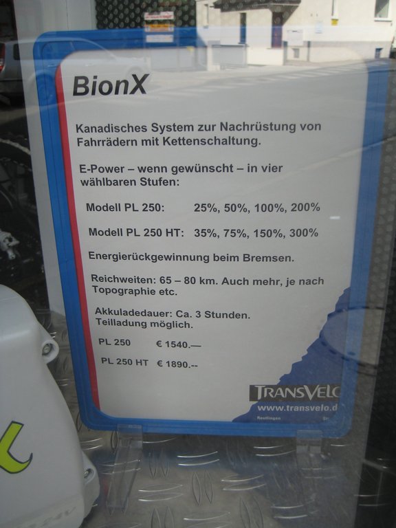 Das Antriebssystem stammt von der kanadischen Firma BionX, die zu den Marktführern bei »besseren« Fachhandelsrädern zählt. Es gibt eine Reihe von Varianten, u. a. führerscheinpflichtige. BionX-Antriebe werden von verschiedenen Fahrradherstellern verbaut und sind auch als Nachrüst-Kits erhältlich. Das System ist in der Tat nicht ganz billig: Beim Versender kostet es, mit komplettem Hinterrad, immerhin 1.950 €.
