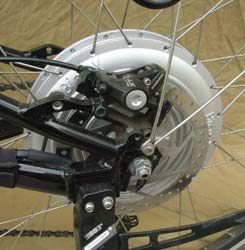 Der 250-W-Motor (der Gerüchten zufolge getunt auch 350 W können soll) sitzt in der Hinterradnabe, die dementsprechend groß und schwer (nachteilig für die Federung) ausfällt. Der »menschliche Hilfsantrieb« des Nabenmotors ist ein Shimano-8-fach-Schraubzahnkranz mit 13 bis 32 Zähnen, geschaltet mit SRAM Gripshiftern über ein SLX-Schaltwerk.