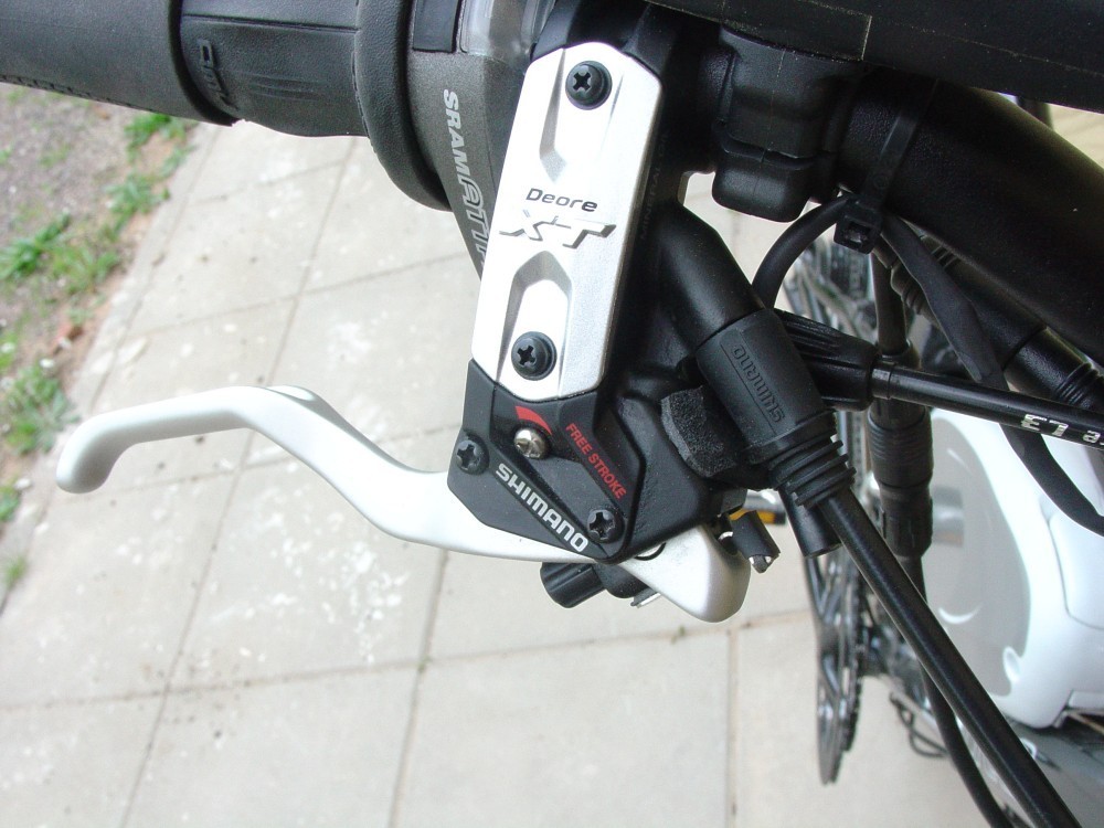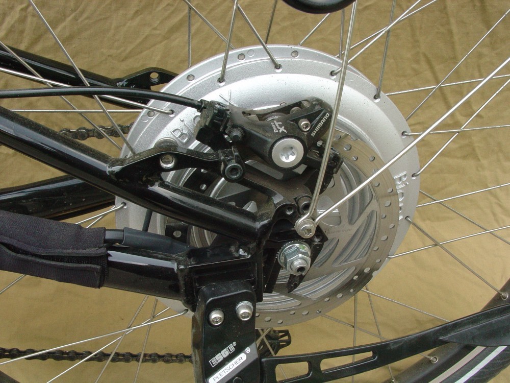 Die XT-Vorderradbremse mit 160er Scheibe war für mich (100 kg) trotz des leichten Gepäcks in einer Packtasche am Gepäckträger (ca. 4 kg) zu schwach: Auch bei brachial fest gezogenem Hebel reichte die Verzögerung nicht, um zuverlässig das Hinterrad anzuheben. Eine 180er Scheibe dürfte es für mich unter diesen Umständen wohl tun, ohne bzw. mit kleinem Gepäck. Für Campinggepäck muss es wohl noch eine Nummer größer sein … allerdings würde es mich nicht wundern, wenn Marzocchi oder/und Riese&Müller solche adäquaten Bremsen nicht freigegeben hätten.