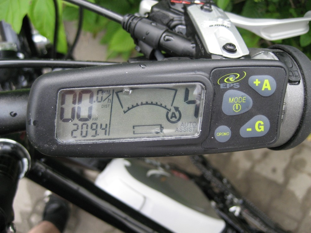 Die Akku-Ladeanzeige begann sich schon früh bei der Bergauffahrt dem Nullpunkt zu nähern. Etwa 15 Höhenmeter vor dem Endpunkt war der Balken längst bei »null« (leeres Feld) angekommen, aber der Motor lief immer noch. Weil das letzte Stück nicht mehr steil ist, ich also notfalls auch ohne Strom weitergekommen wäre, schaltete ich nun versuchsweise auf maximale Unterstützung (Stufe 4). Der Akku schaffte auch noch diese letzten Meter. Aber die Heimfahrt zeigte, dass er dann wirklich praktisch leer bzw. kurz vor Aktivierung des mutmaßlich eingebauten Tiefentladeschutzes) war: Obwohl ich bei der Abfahrt über 500 Höhenmeter im Generatormodus (Akku wird vom Motor geladen) zurücklegte, fiel die Unterstützung bald darauf im Flachland aus. Die letzten Kilometer musste ich die schwere Maschine die mit eigener Kraft weiterfahren – und wünschte mir dabei eins meiner Mountainbikes, die sind schneller.
